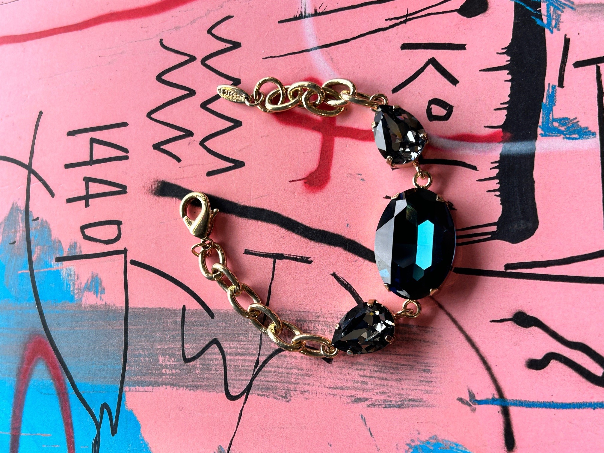 Bransoleta mosiężna, złocona 24K złotem, wyrazista, z pięknymi, niebiesko – szarymi kryształami.